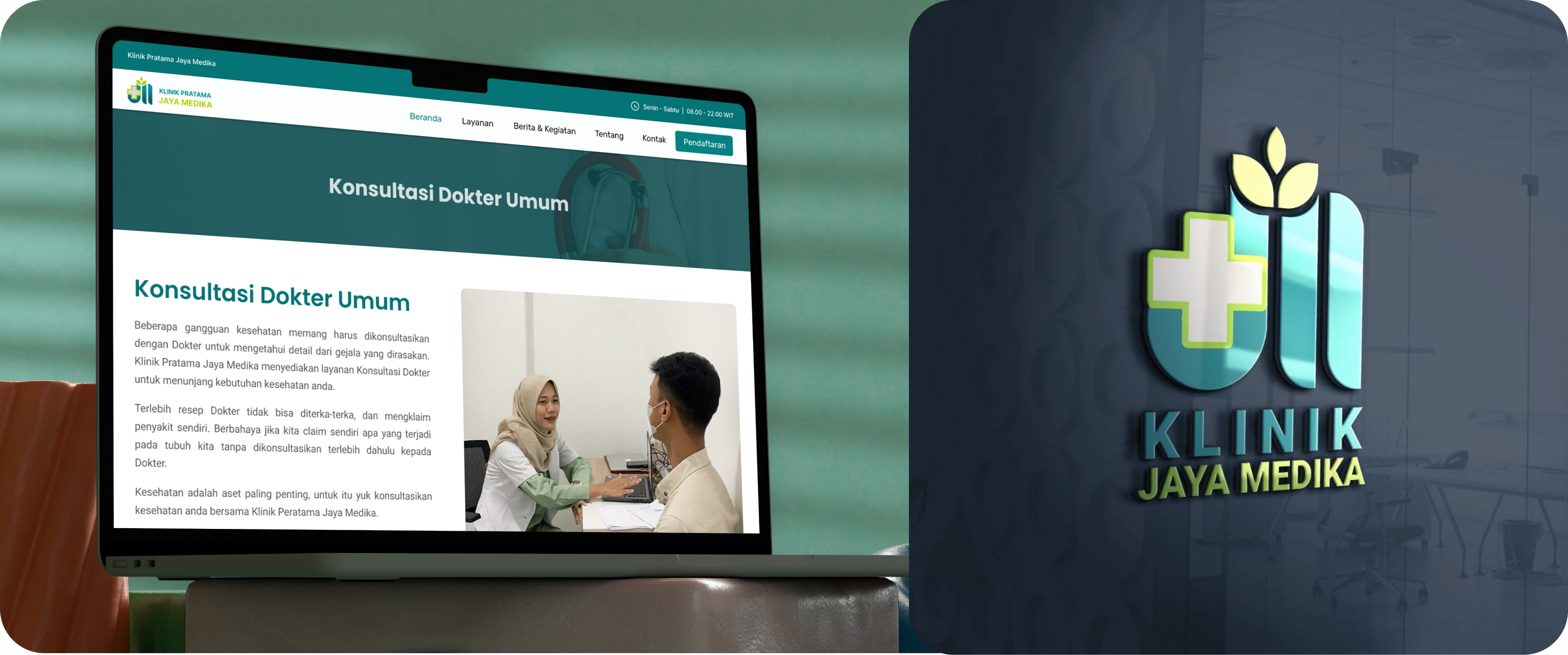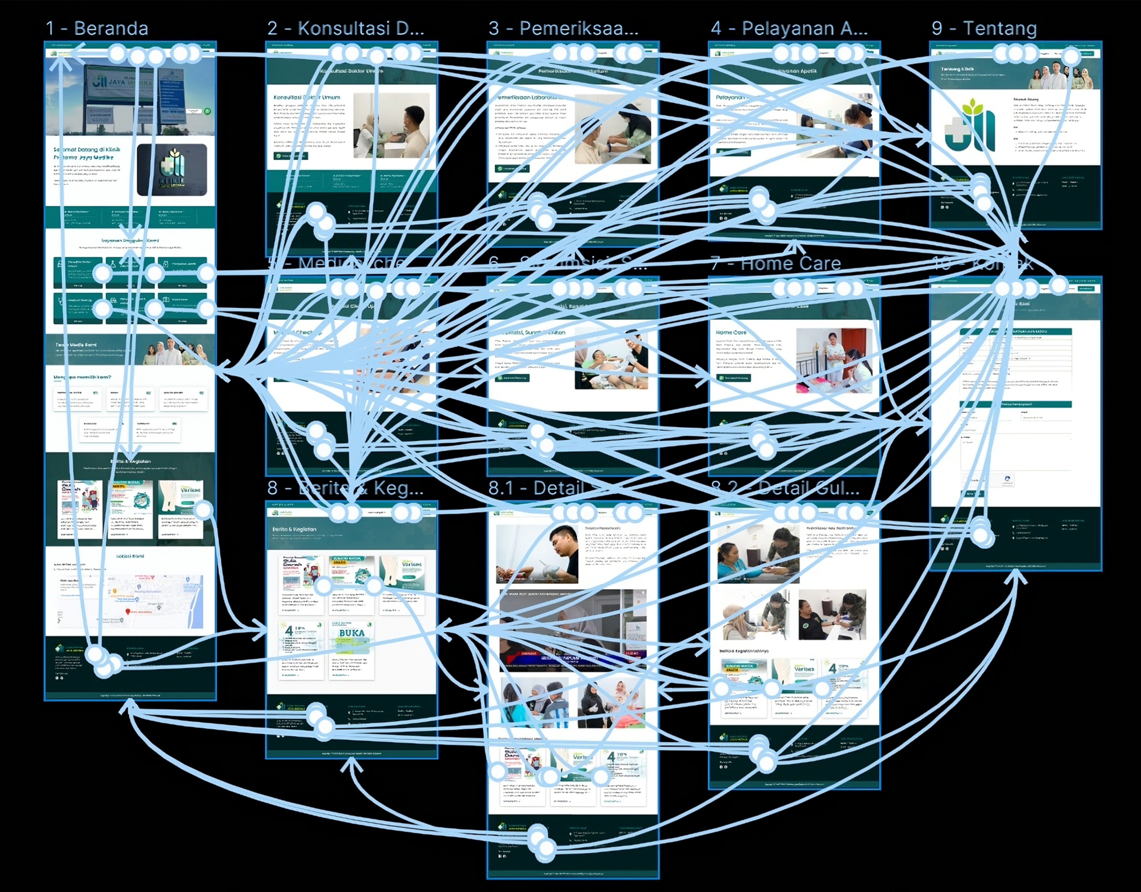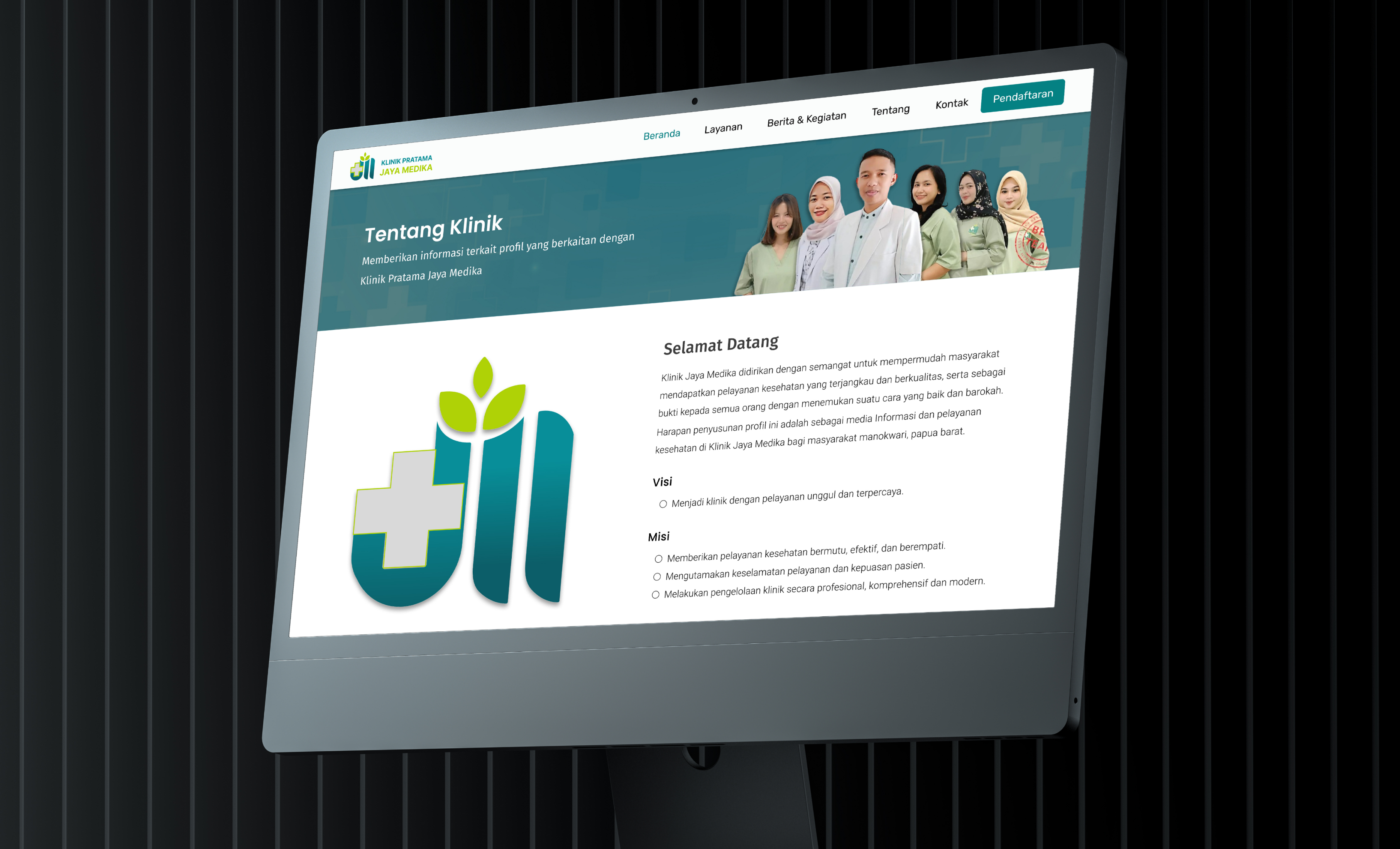 Rancangan website klinik jaya medika yang fokus pada kemudahan akses layanan bagi pasien. Website dibagi ke dalam beberapa menu utama, yaitu Home, Layanan, Berita & Kegiatan, Tentang dan Kontak, serta dilengkapi fitur Registration.