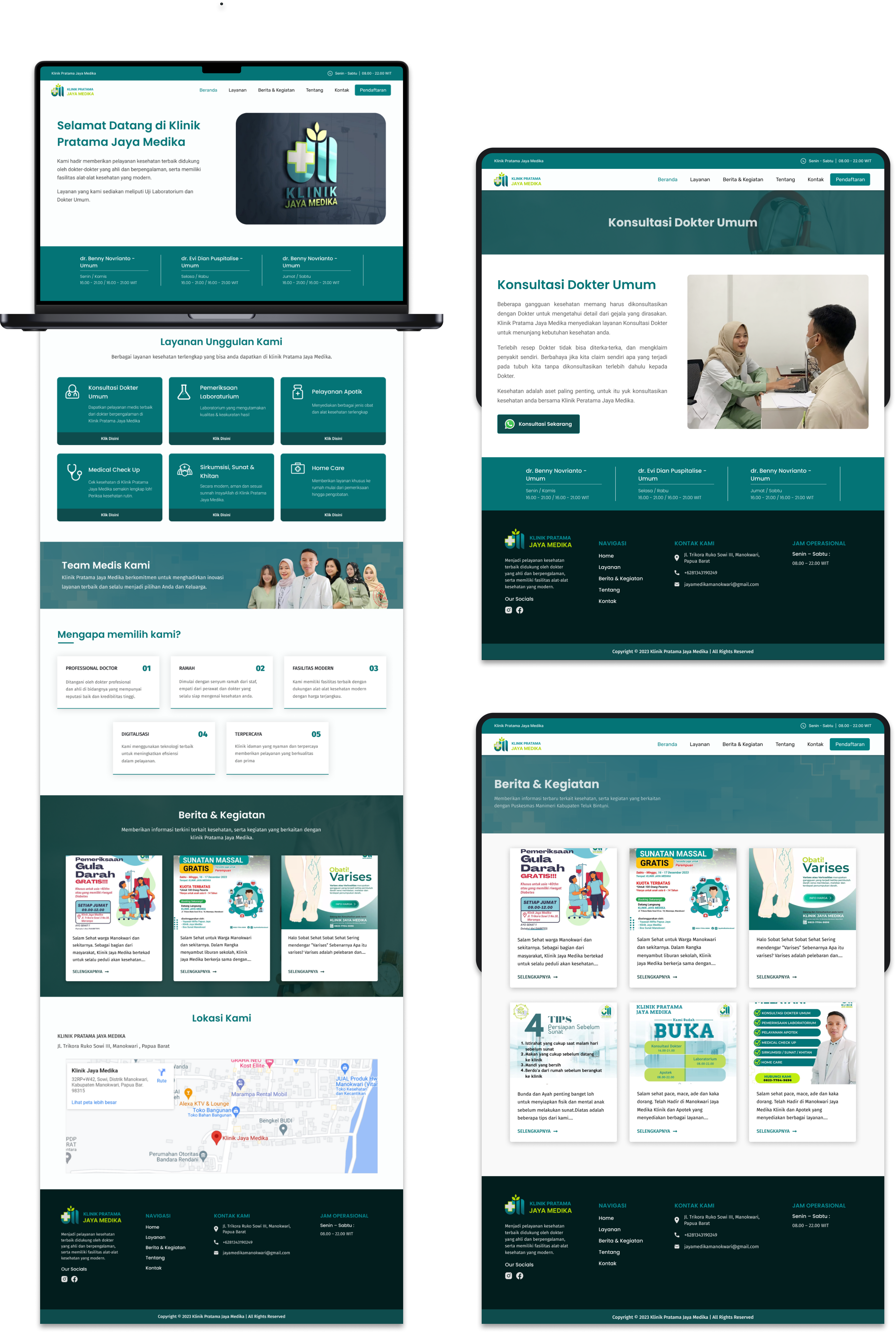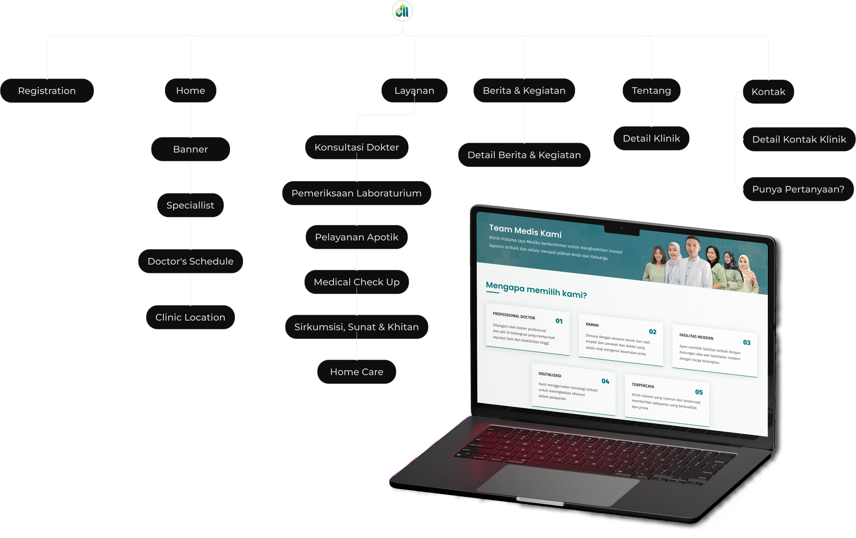 Pada halaman home tersedia informasi penting seperti spesialis dokter, jadwal praktek dan lokasi klinik. Bagian layanan mencangkup berbagi fasilitas, mulai dari konsultasi dokter, pemeriksaan laboraturium, madical check up. Selain itu, dengan struktur ini, website klinik menjadi lebih informatif, teratur, dan mudah digunakan oleh pasien maupun pengunjung.
