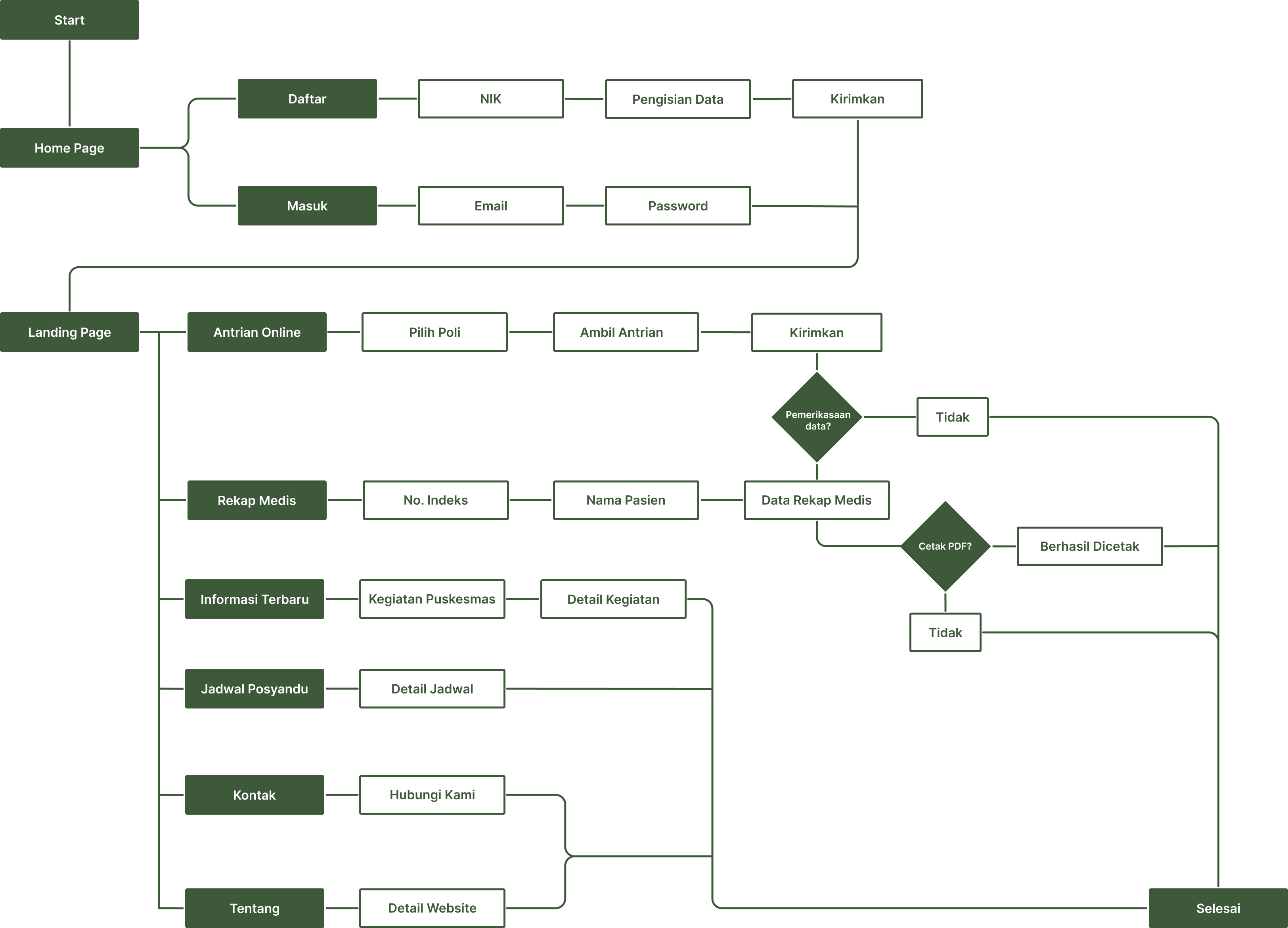Sistem layanan puskesmas berbasis web yang memudahkan pengguna dari tahap awal hingga selesai. Pengguna dapat melakukan registrasi atau login, kemudian diarahkan ke halaman utama yang berisi berbagai fitur seperti antrian online, rekap medis, informasi terbaru, jadwal posyandu, kontak, dan tentang.